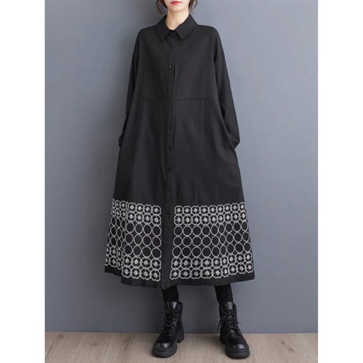 シャツカラー 長袖 Aライン 刺繍 シャツワンピース D00001