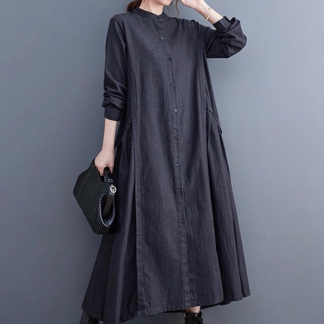 デニム素材で作られたワンピースは、カジュアルでありながら女性らしさを引き立てるデザインが魅力