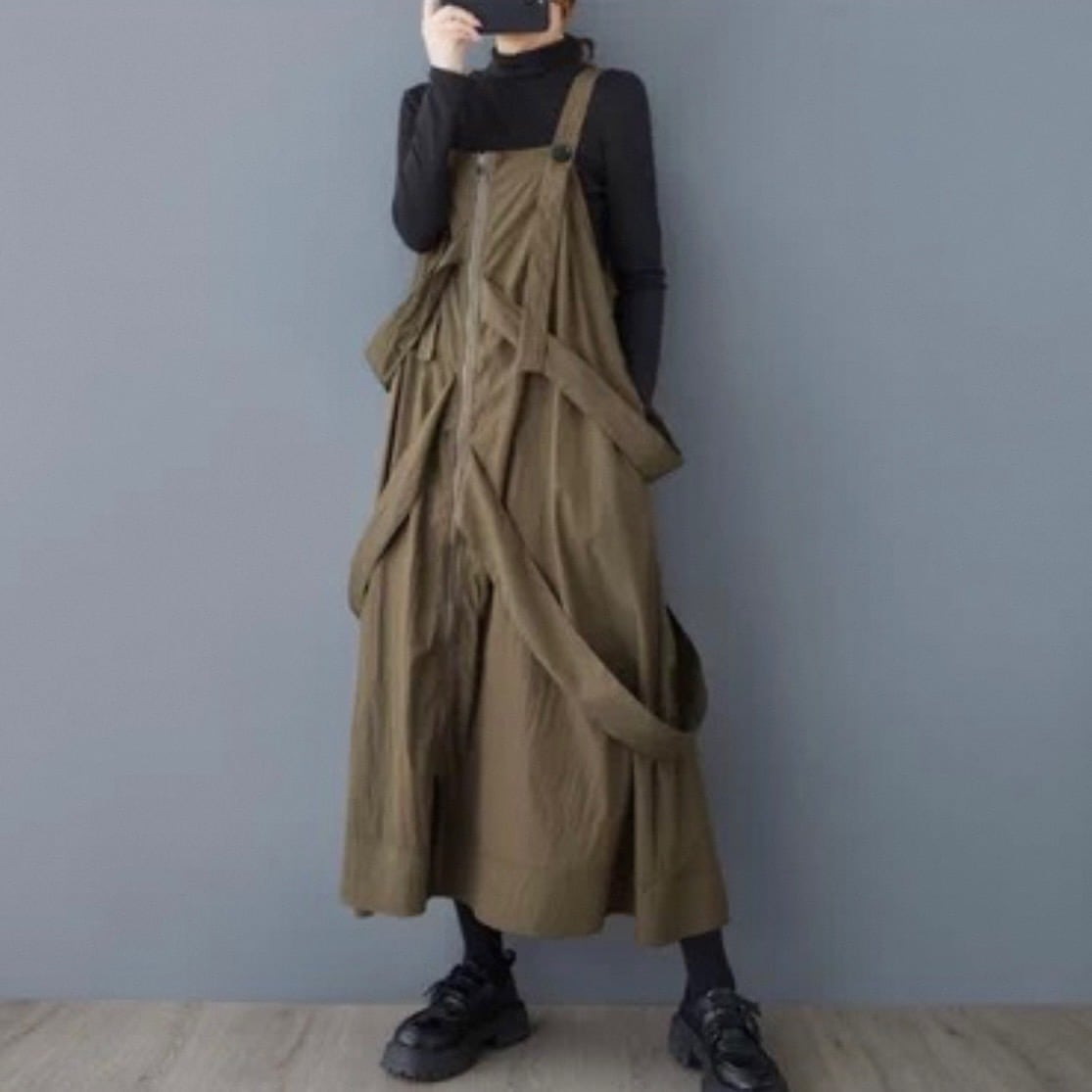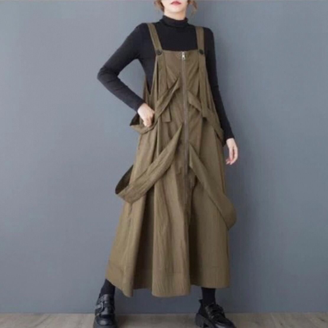 ジップアップ Aライン ミモレ丈 サロペットワンピース D00063